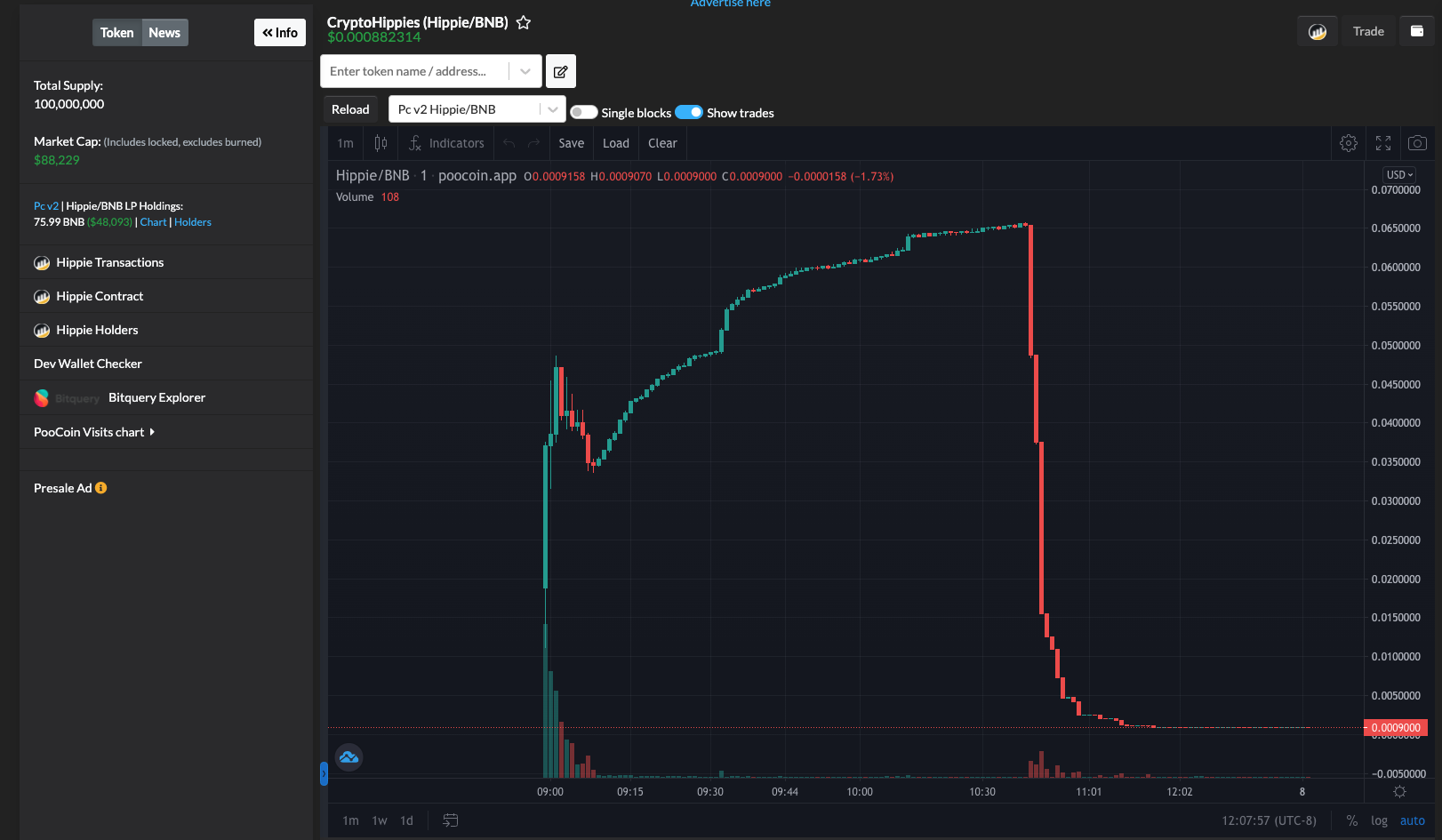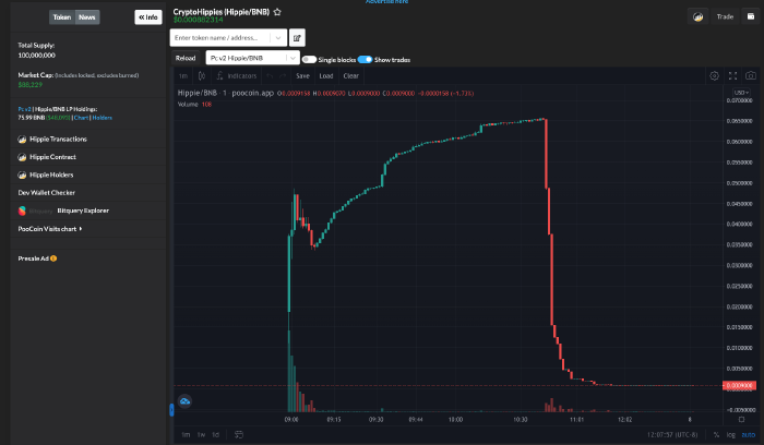 In a span of one minute, the owner turned the project into a honeypot. Resulting in this chart below that rugged after 1.5 hours.