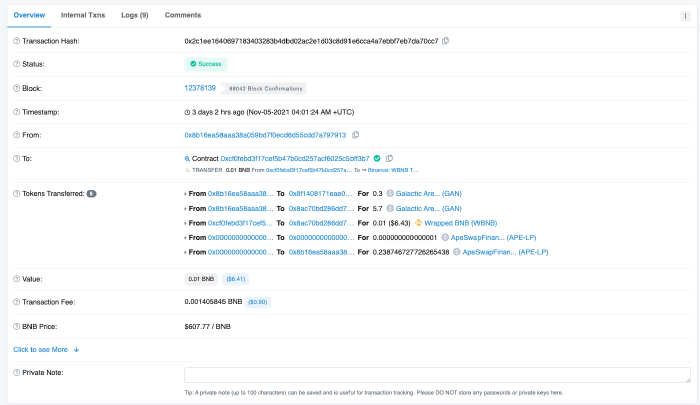 To make the matter worst, the Galaxy Arena team decided to only add 200 BNB ($120,000) around into the liquidity once they figure out how to balance the ratio by adding more tokens into the reserve to balance out the price. The project owner collected $800,000 from ApeSwap IDO and $200,000 from Poolz but ended up adding around only 200 BNB to the liquidity.